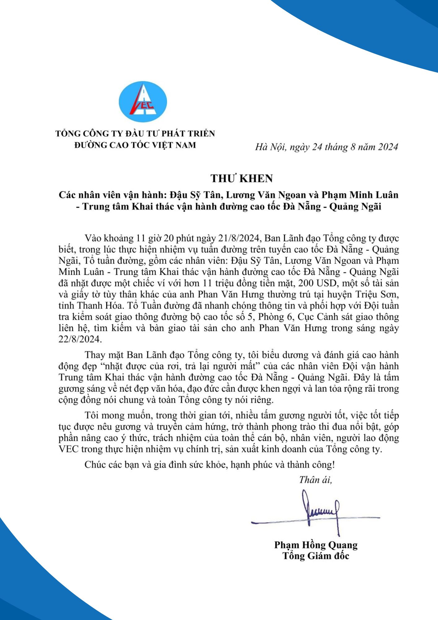 Thư khen của Tổng Giám đốc VEC về tấm gương người tốt, việc tốt của Đội vận hành